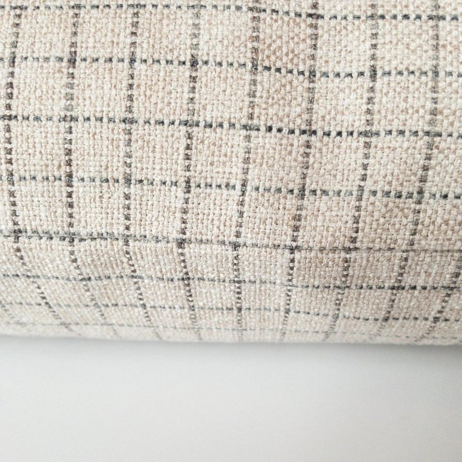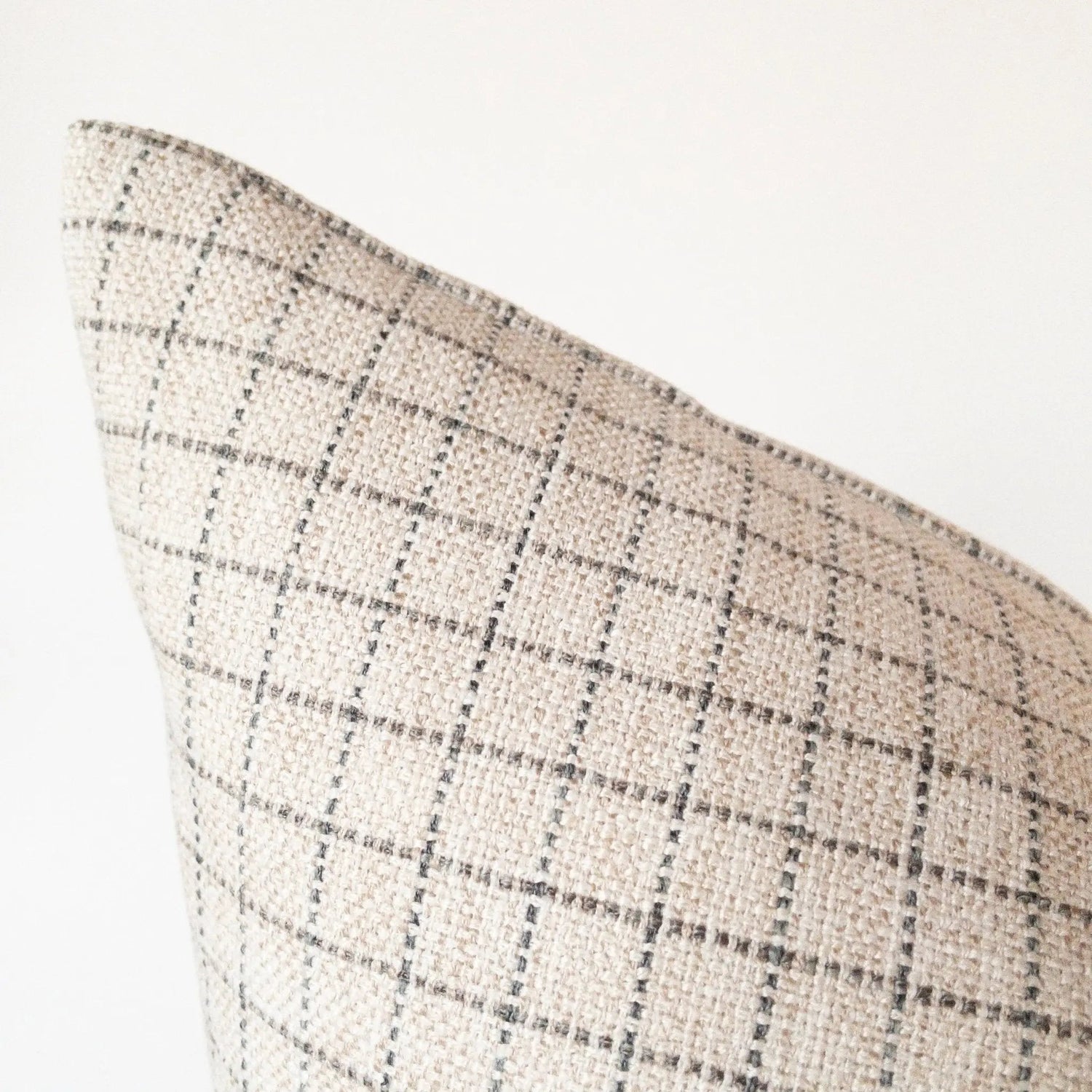 The Eloise plaid pillow cover showcases a finely woven beige base, accented by a delicate windowpane plaid in soft grey and muted blue. Its subtle texture and refined design create a timeless, inviting look that blends seamlessly into any decor. Perfect for layering, it adds warmth to cozy spaces or a polished touch to more tailored settings.