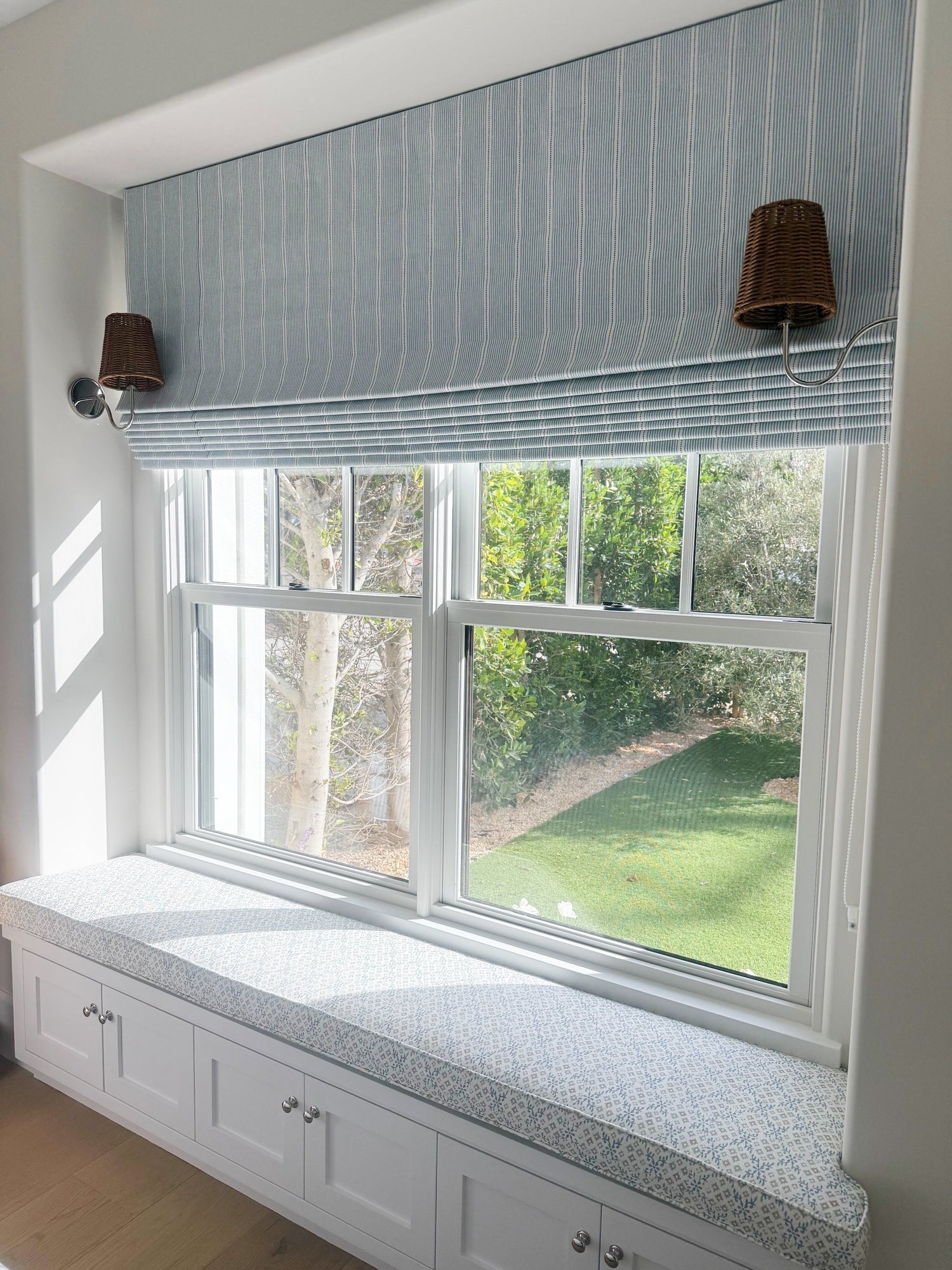 Our Isla fabric is a blue stripe fabric blends coastal charm with a relaxed, lived-in feel, perfect for creating spaces that welcome you home. Softly textured with evenly spaced stripes in a calming blue, this versatile fabric works beautifully for drapery, pillows and light upholstery. Its breathable weave drapes effortlessly, allowing you to layer in patterns and color while keeping the look fresh and inviting. Whether styled in a sunny breakfast nook, a breezy living room, or a cozy reading corner, the Isla blue stripe fabric ads a touch of timeless ease to your home.